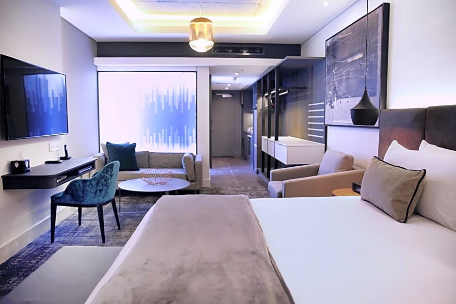 This modern apartment has a separate bedroom and features air conditioning, a seating area, and a kitchen. The bathroom is fitted with a bath and shower.